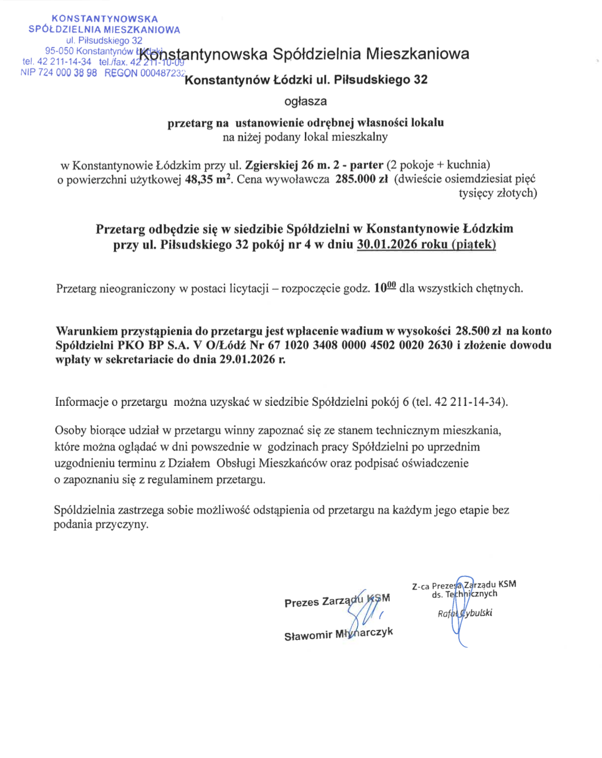 Wadium w wysokości 28500 zł należy wpłacić na konto KSM i złożyć dowód wpłaty do dnia 29 stycznia 2026 ( PKO BP SA. V O/Łódź o nr. rach.: 67 1020 3408 00004502 0020 2630 )
